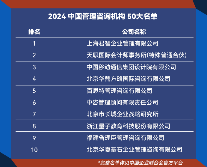 12月8日,中国企业联合会(以下简称:“中企联”)以2023年管理咨询机构营业收入为入围标准,推出“2024中国管理咨询机构50大”名单。